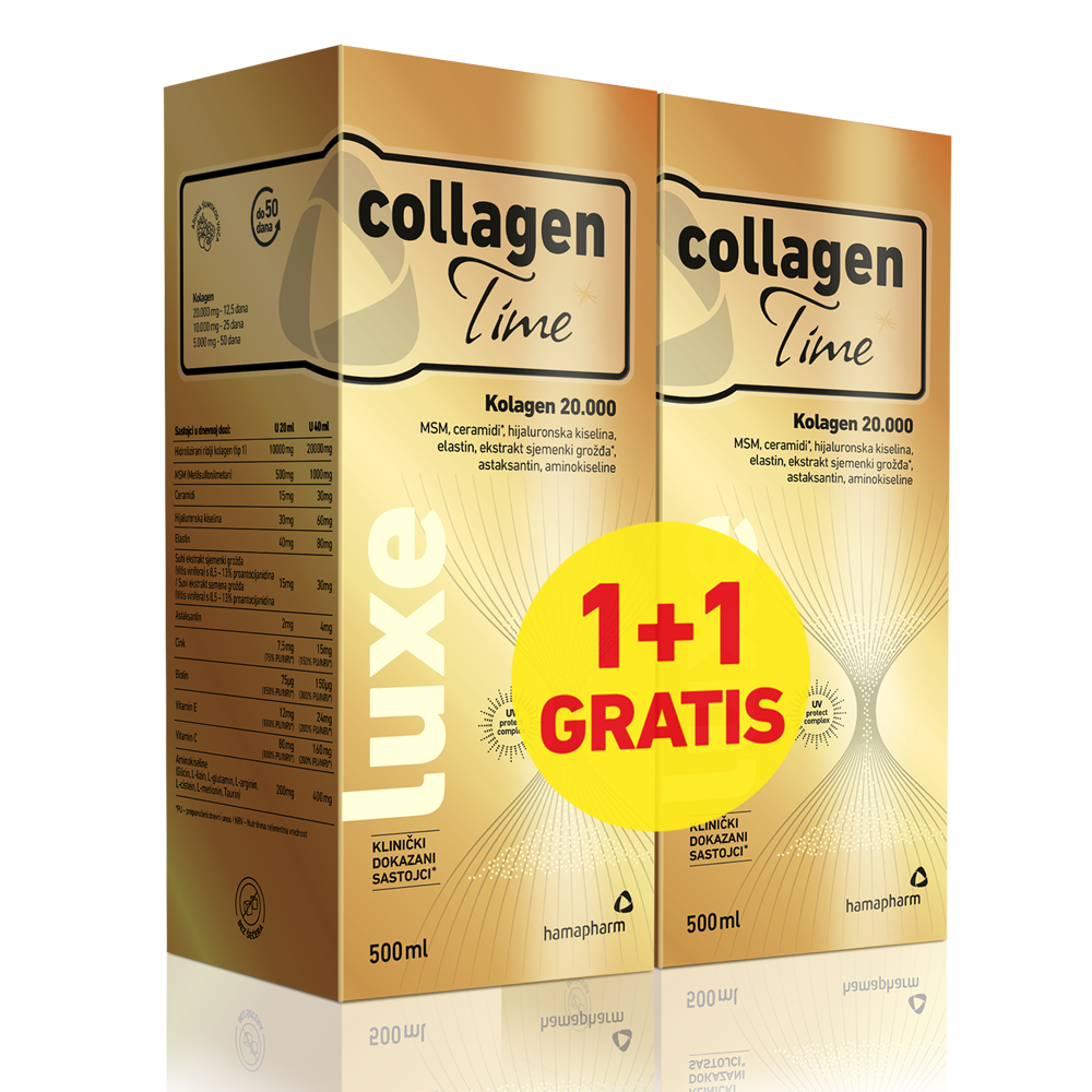 CollagenTime Luxe tekući kolagen dubinski obnavlja kožu, kosu i nokte uz pomoć najviše doze kolagena na tržištu (20.000 mg u 40 ml) i UV protect complexa: